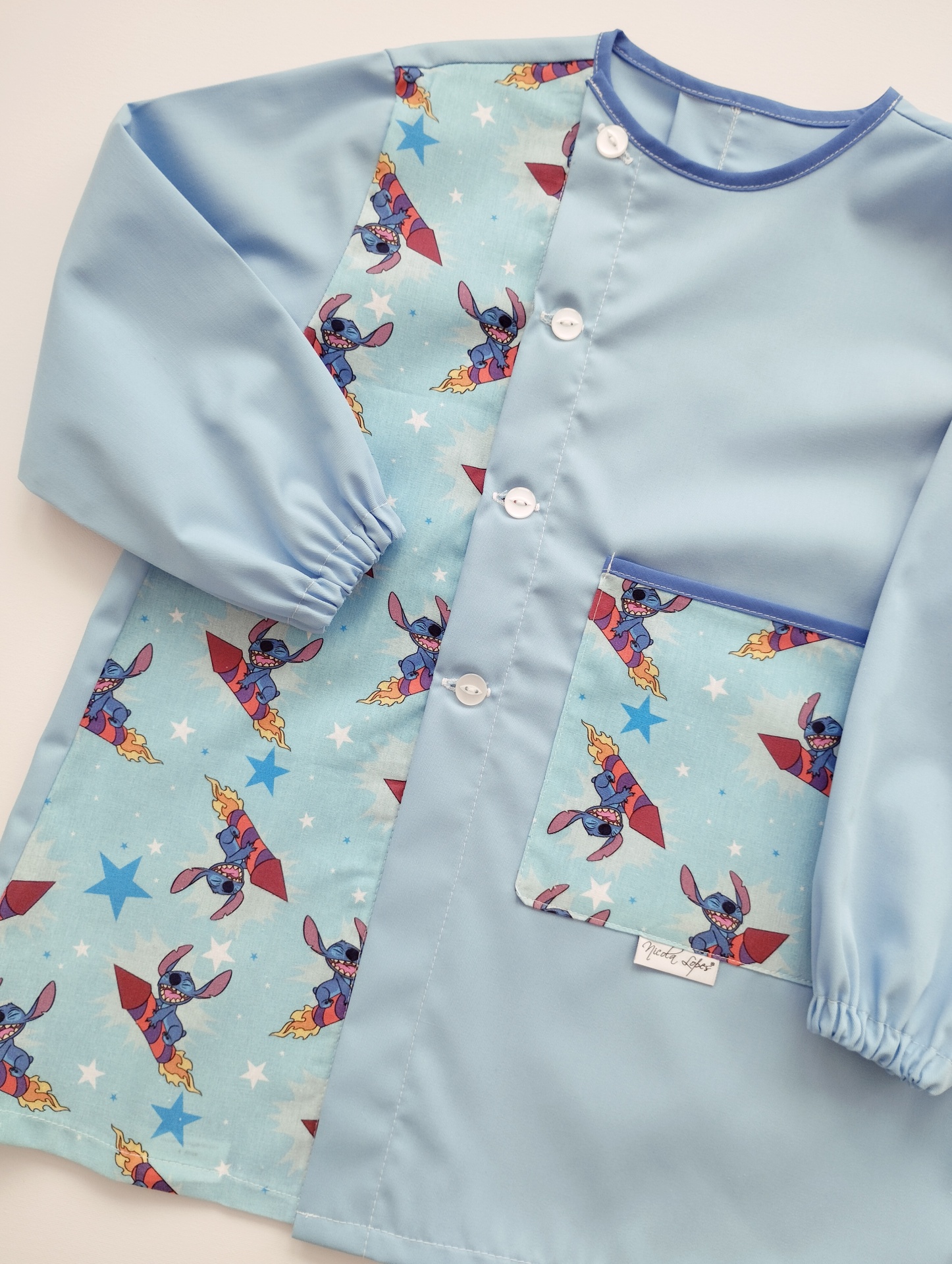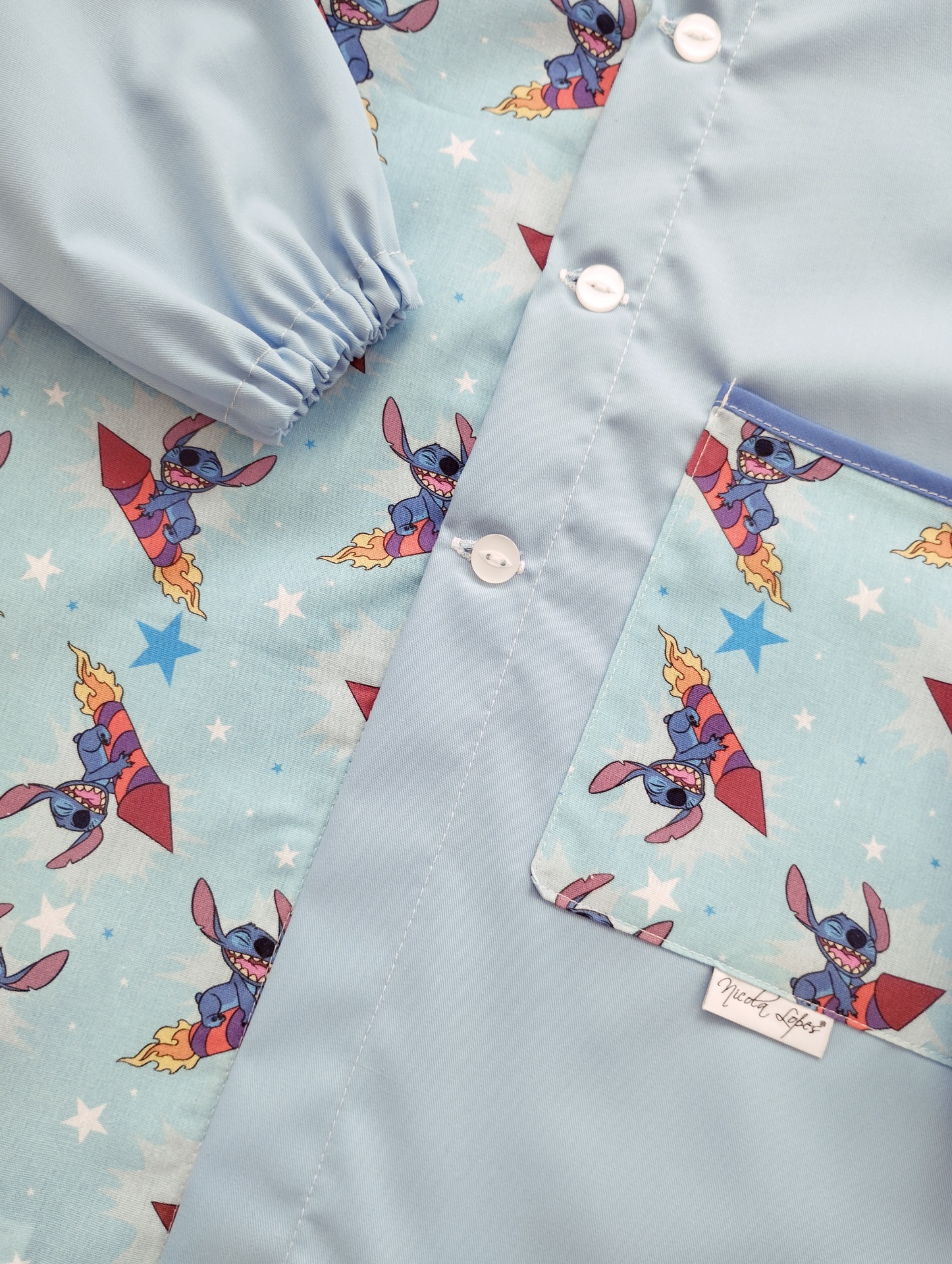 - Tecido em sarja, liso, cor azul claro, padrão fundo azul com foguetões e o Stitch!