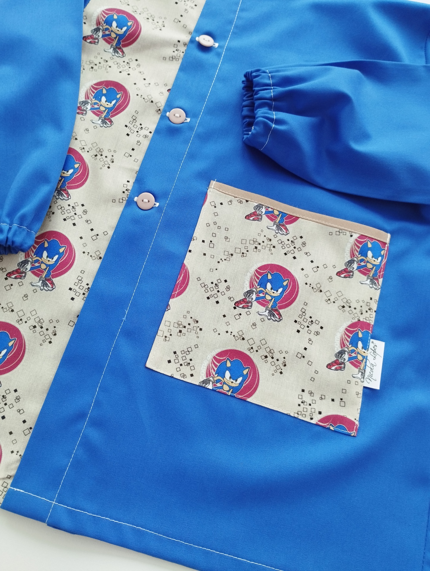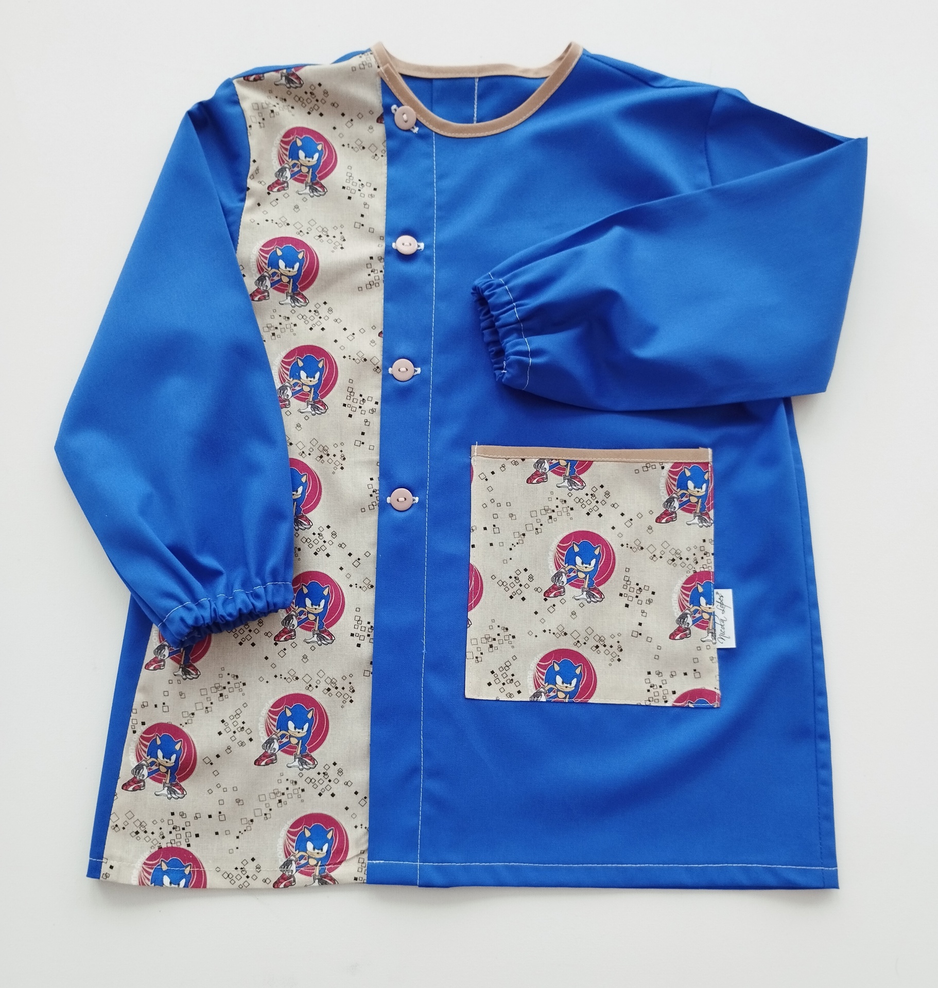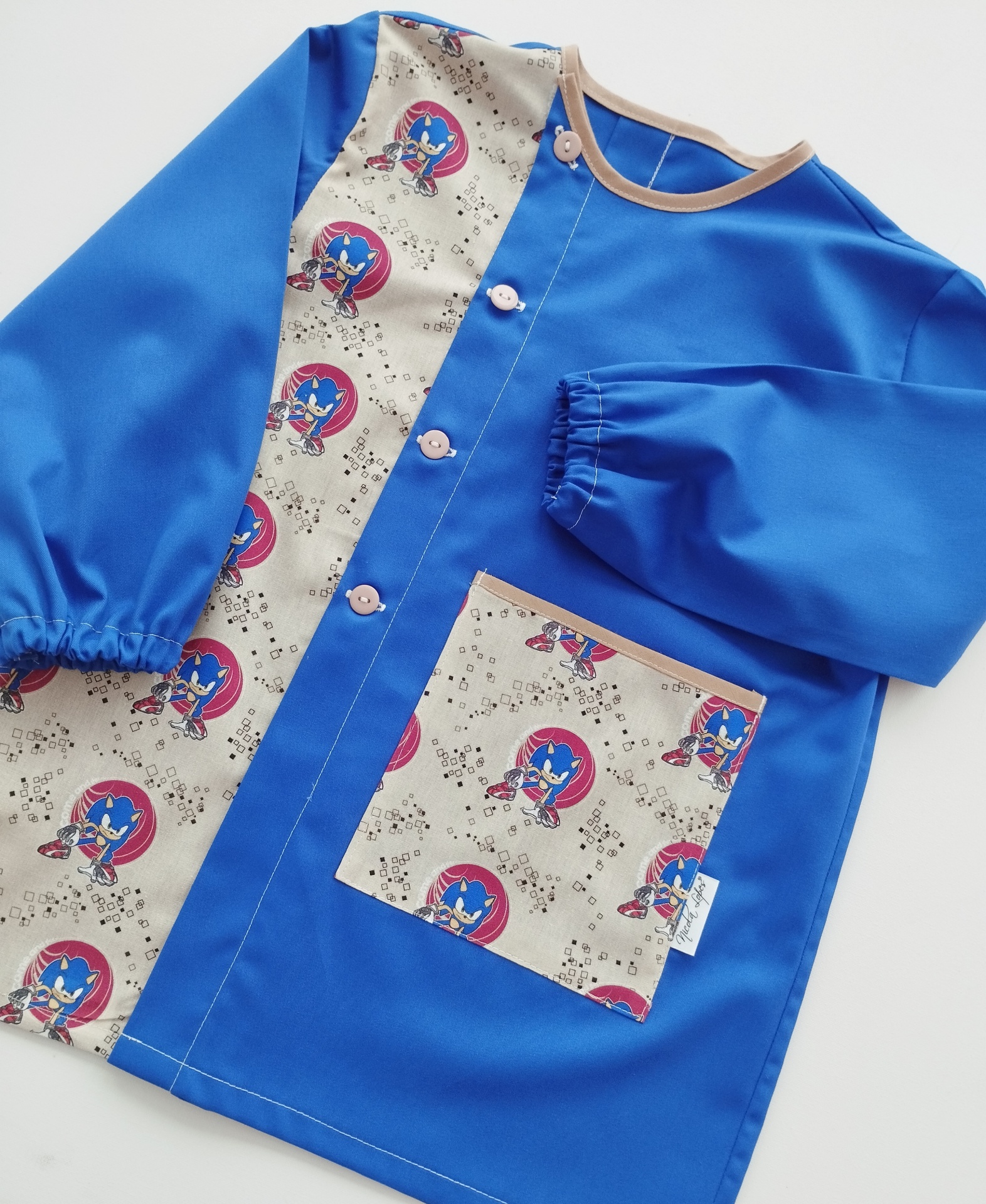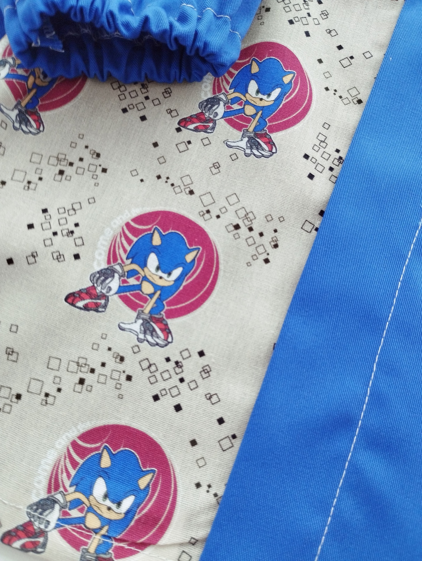 - Tecido em sarja, liso, cor azul , padrão com fundo bege com o Sonic!