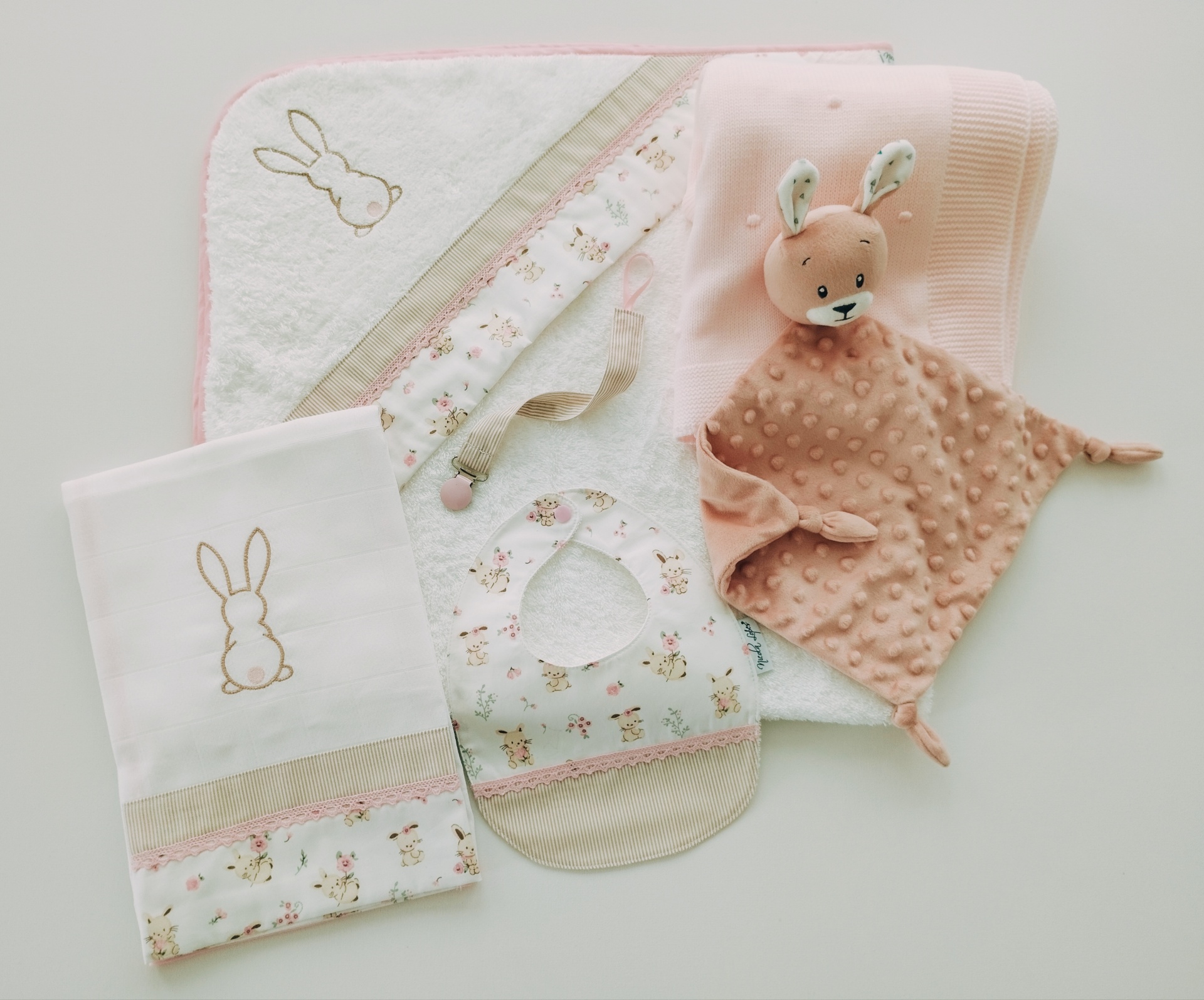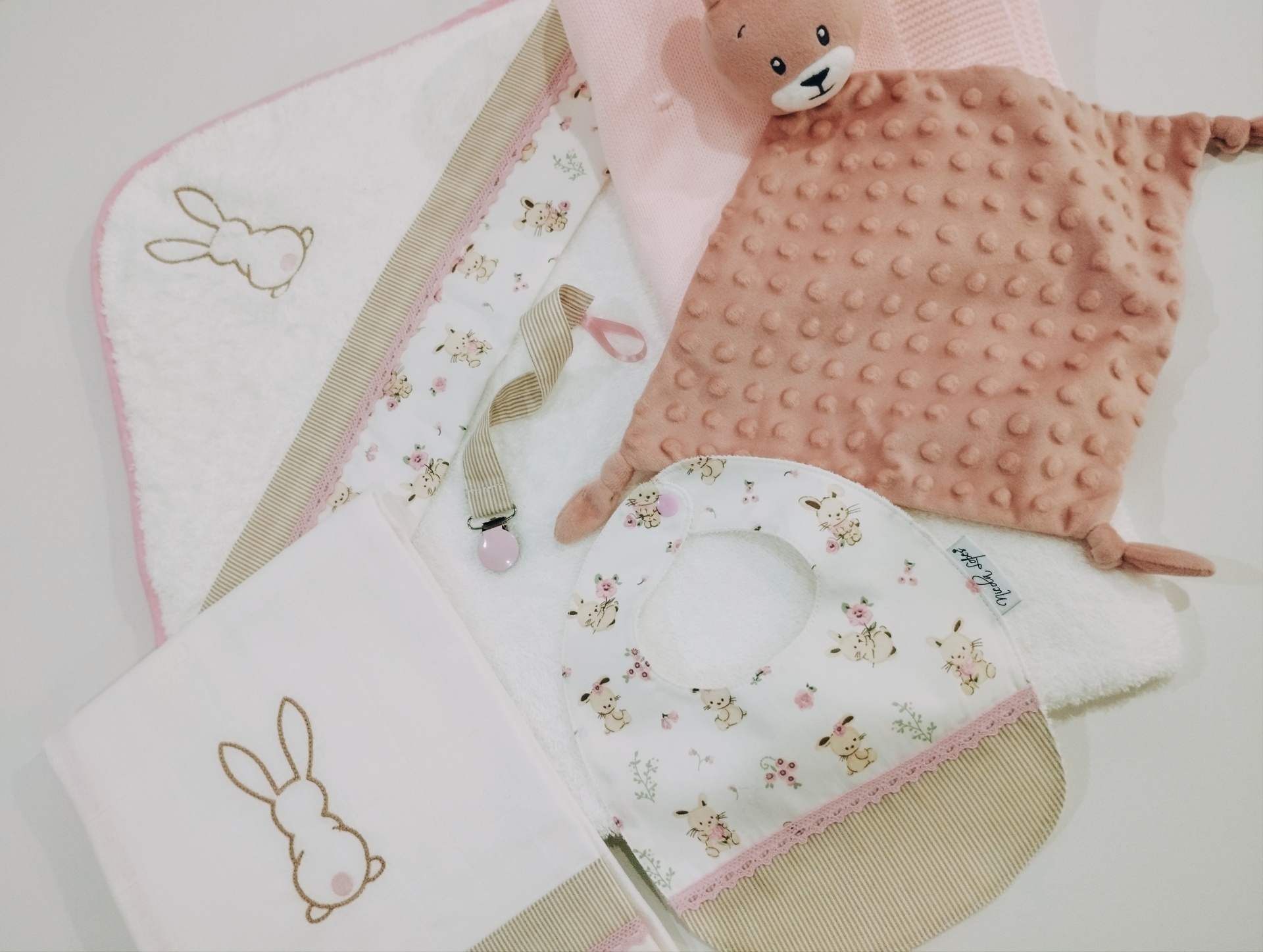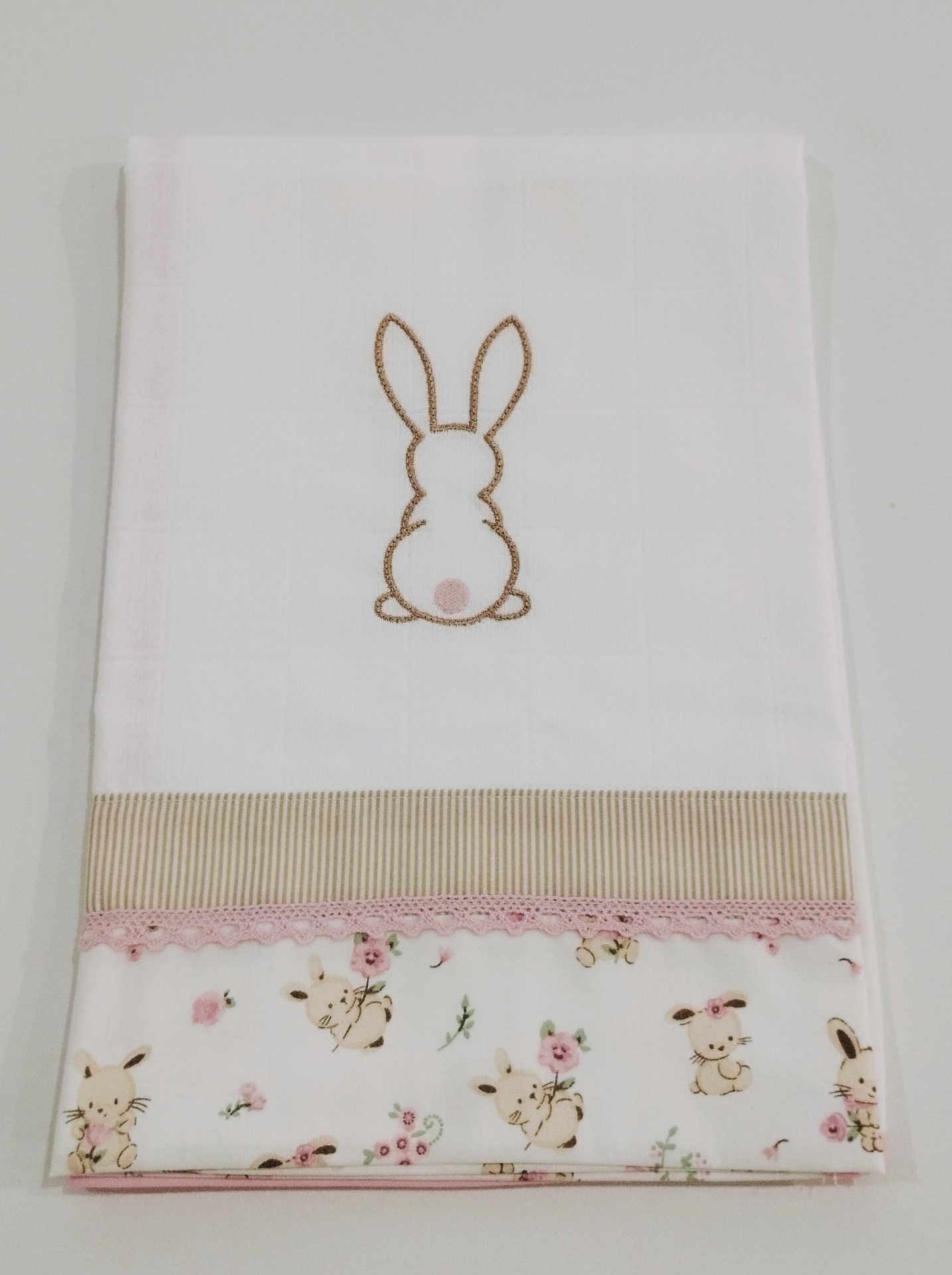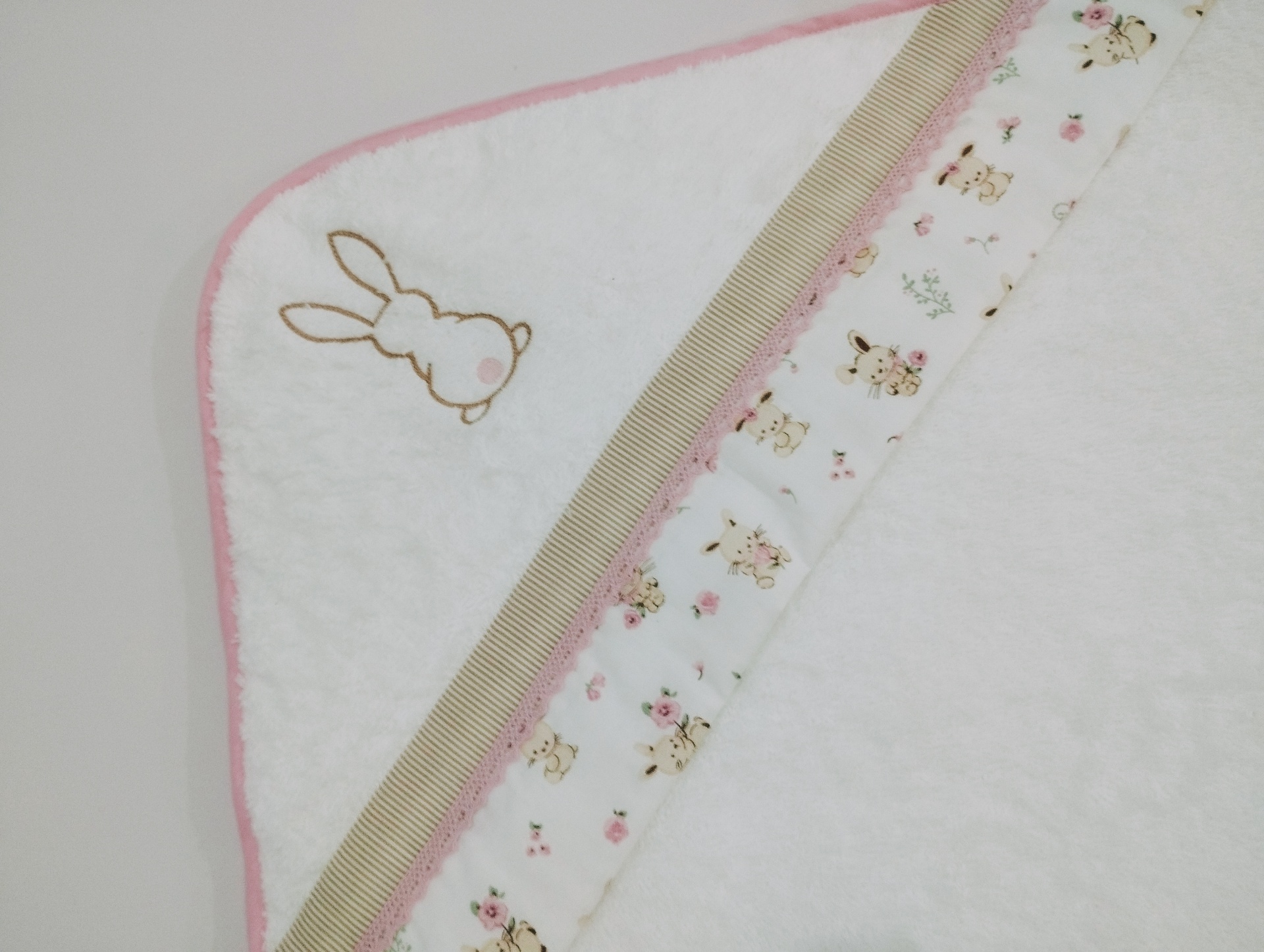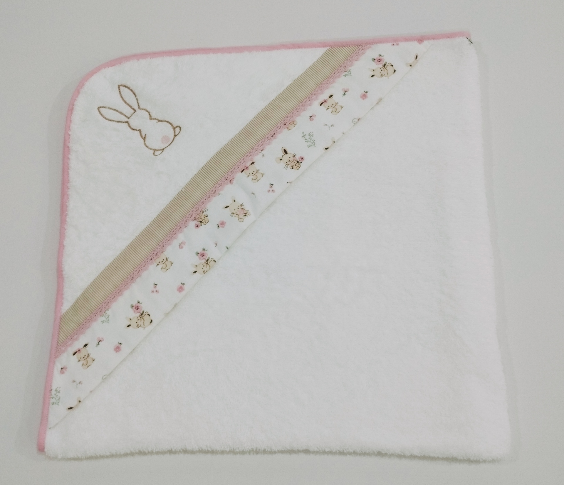 - Uma toalha de banho 1mt x 1mt com capuz Bordado