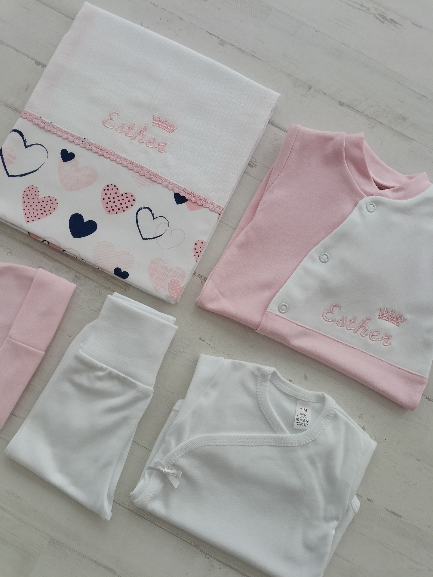 Dê as boas-vindas ao seu bebé com um conjunto especial e exclusivo! Este adorável conjunto inclui gorro, body, calça, babygrow e fralda, sendo que o babygrow e a fralda podem ser personalizados com o nome do bebé.