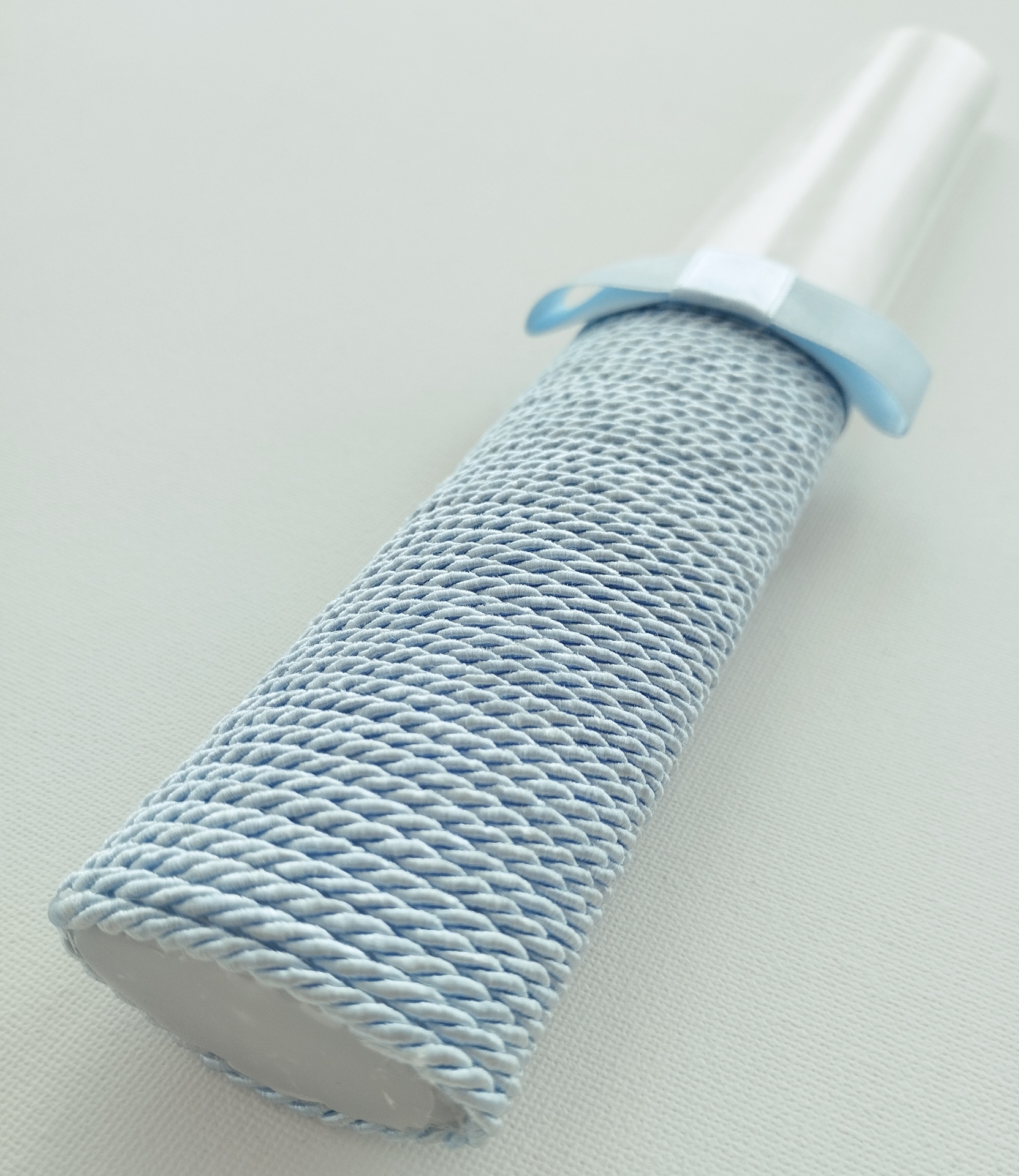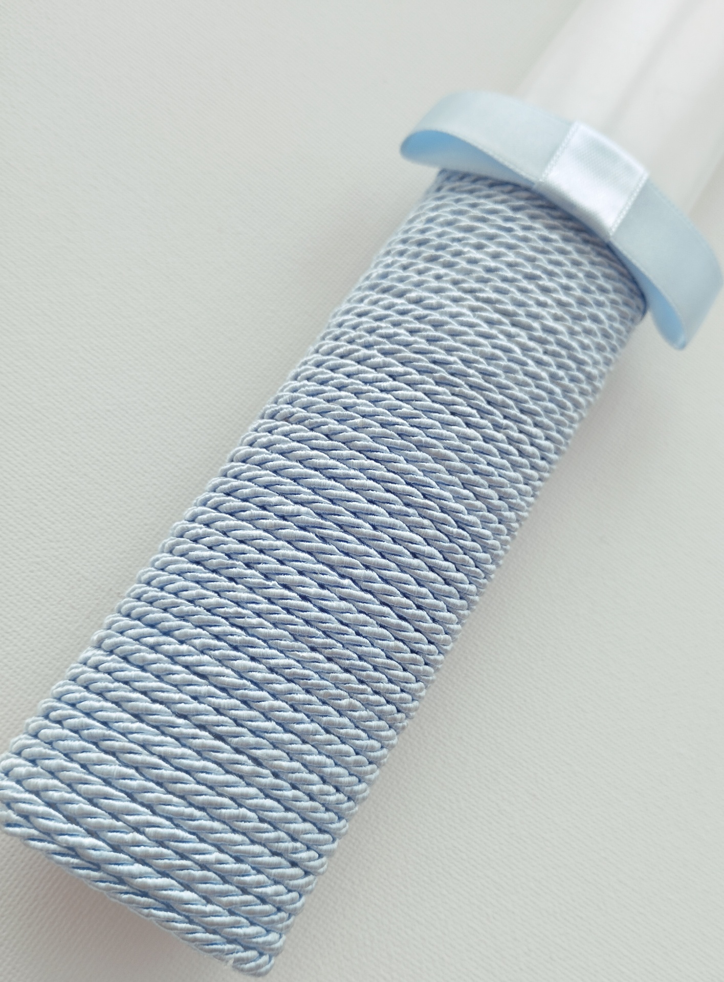- Decoração em cordel azul, com pequeno laço em cetim.