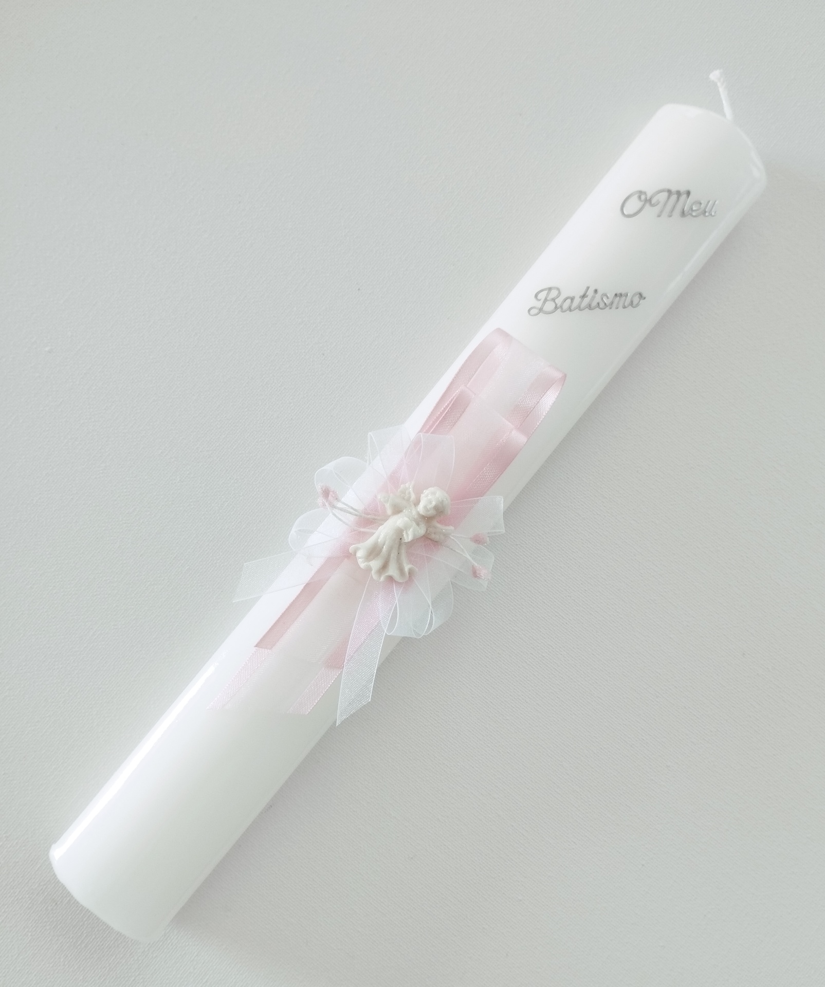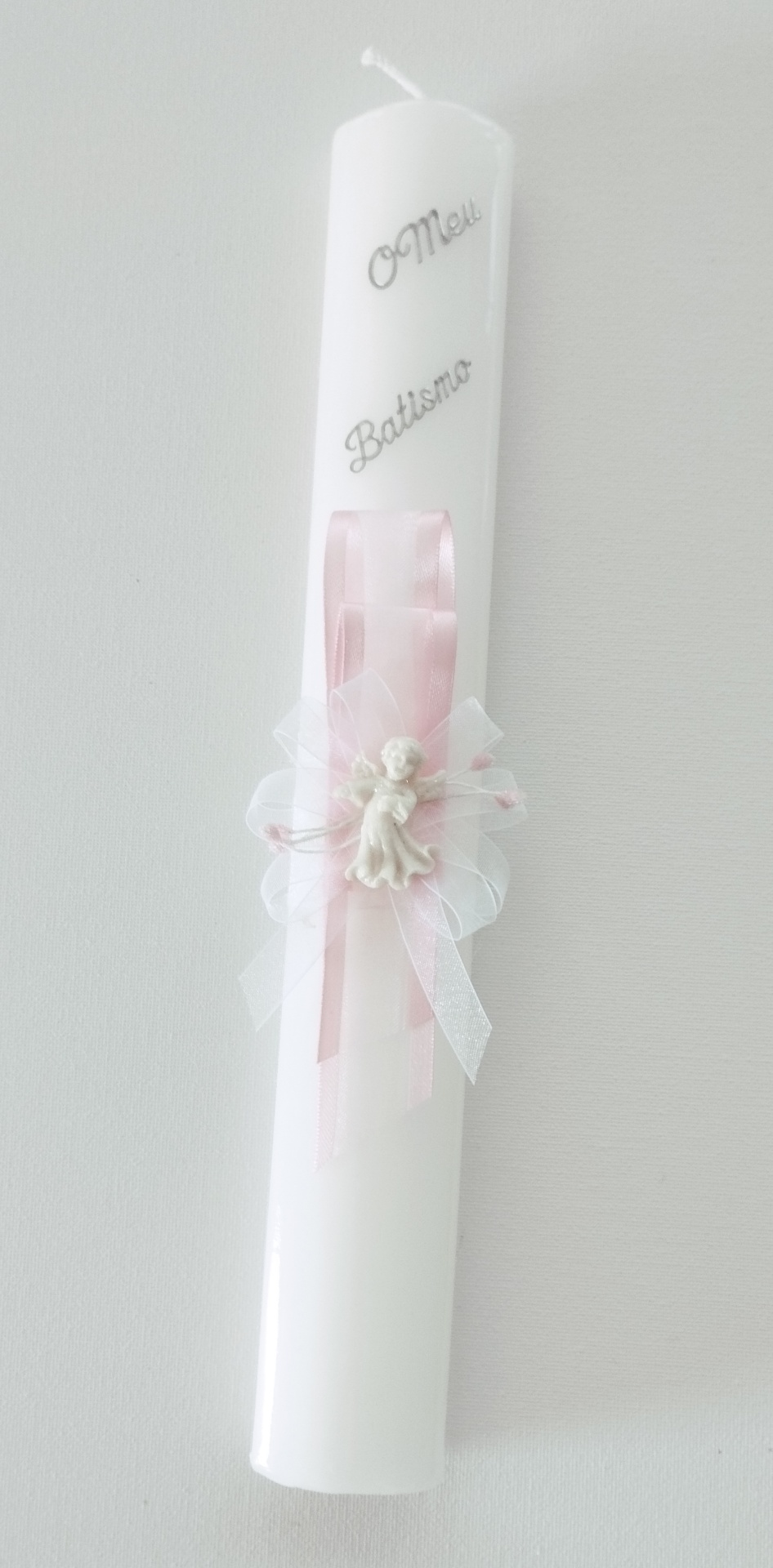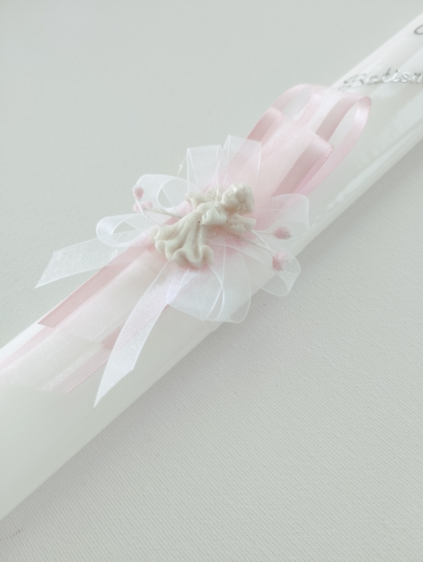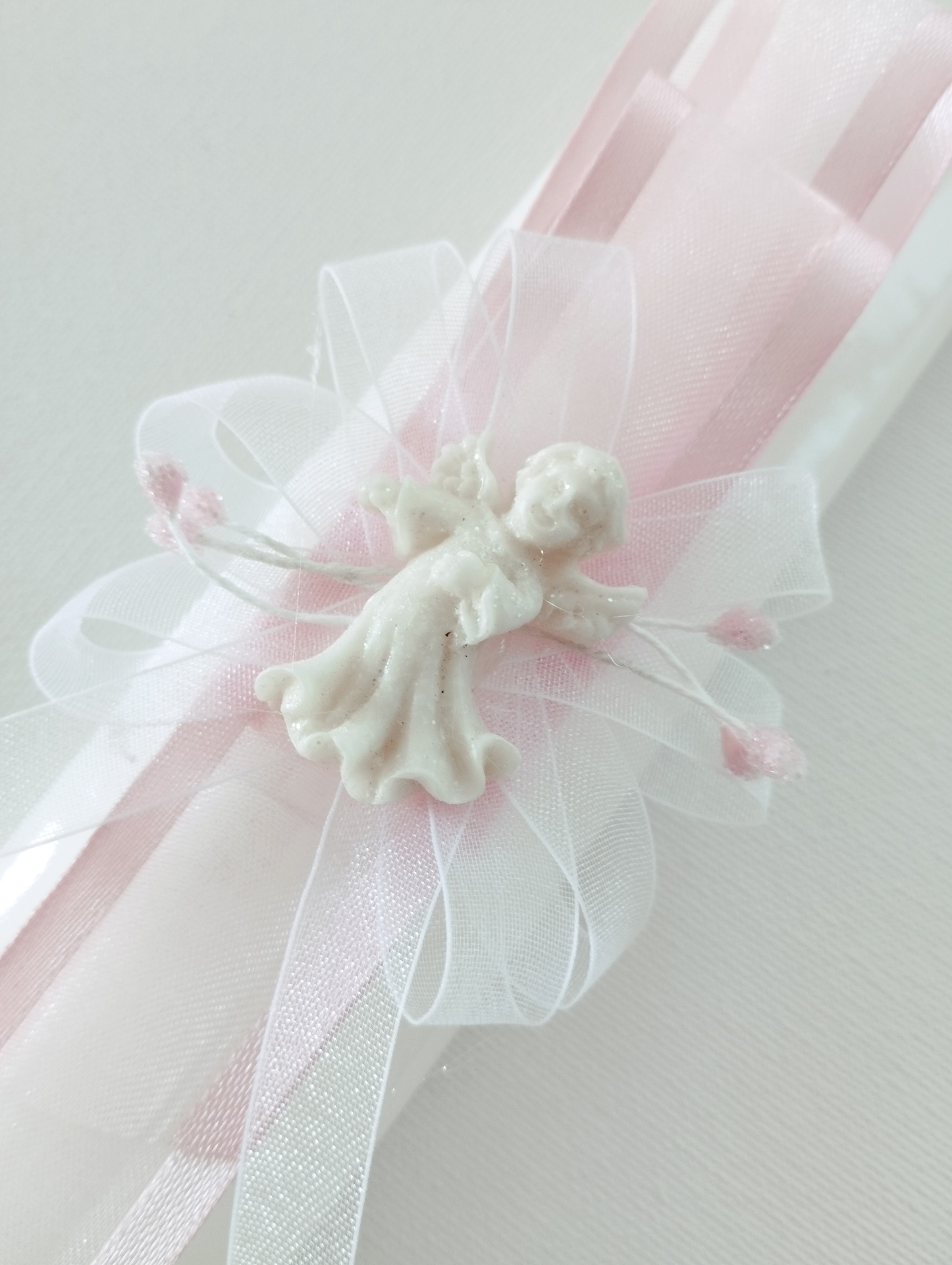 Decorada com fita de cetim rosa bebé e branco, com um anjo.
