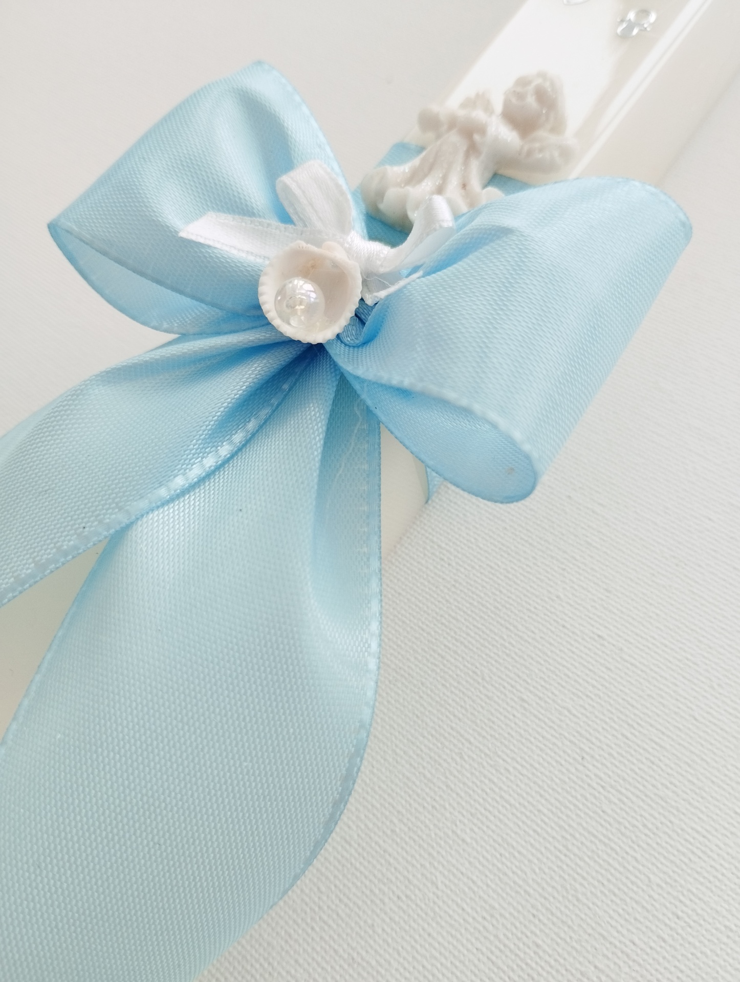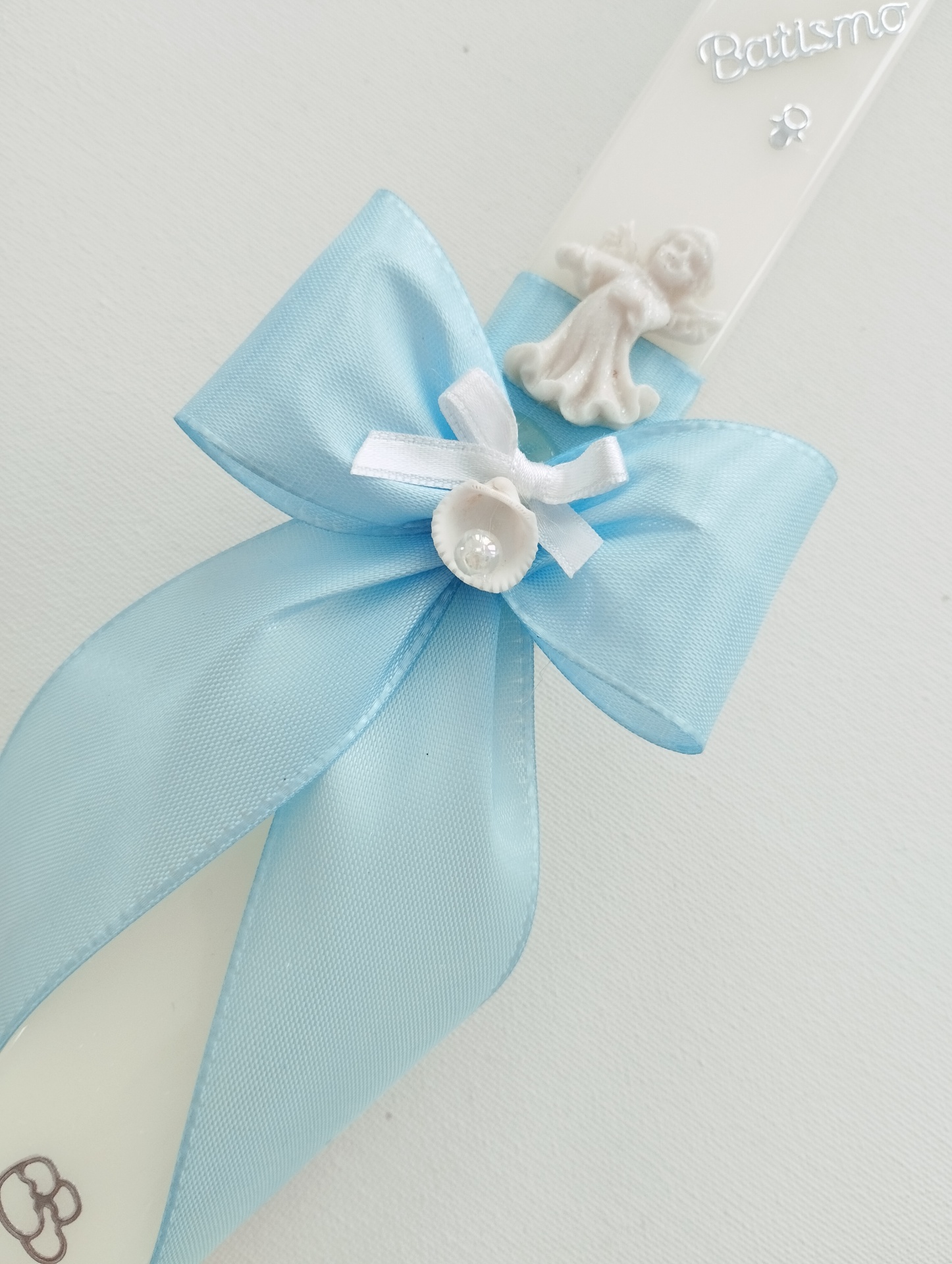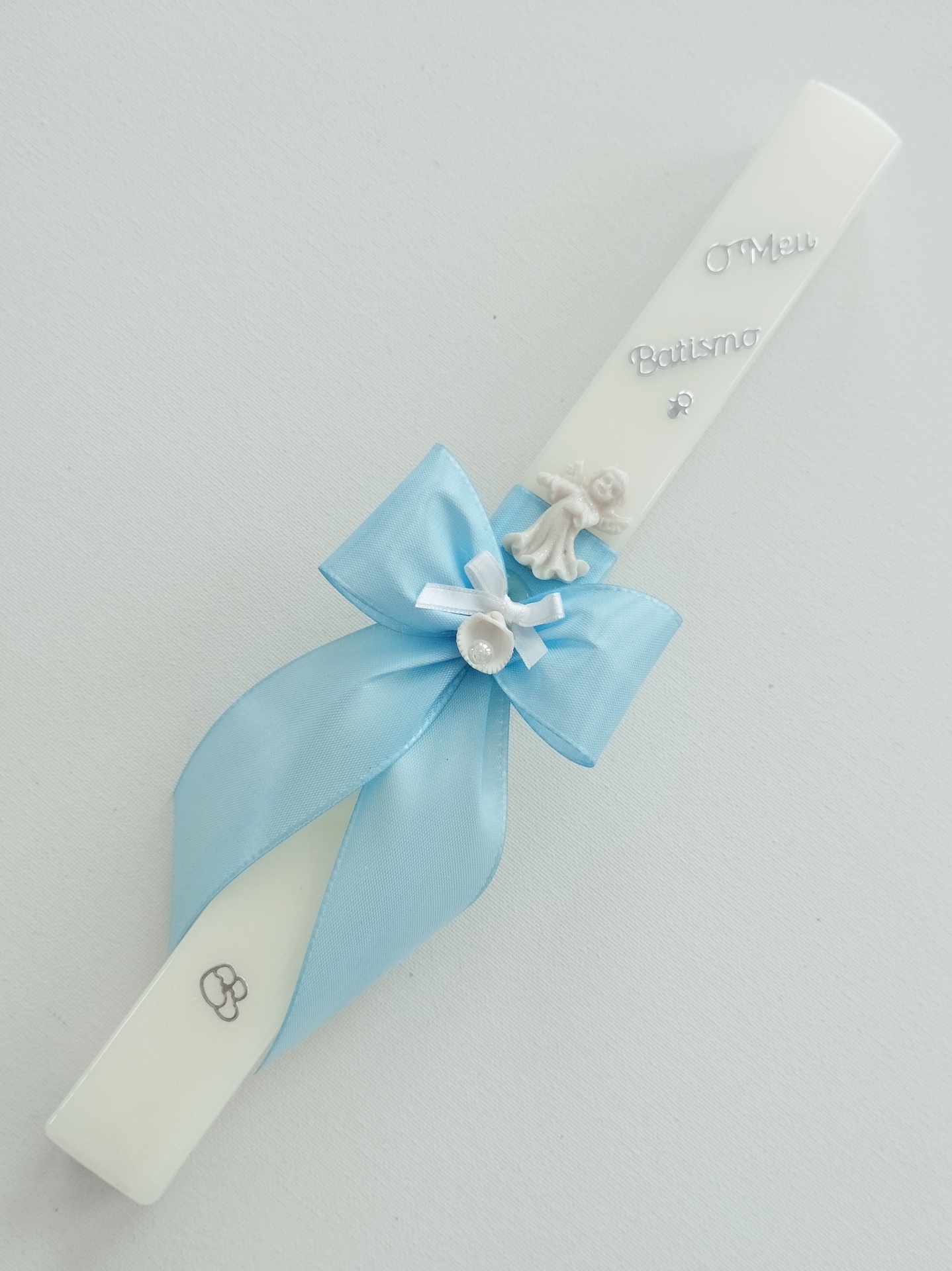 - fita em cetim azul formando um laço.
